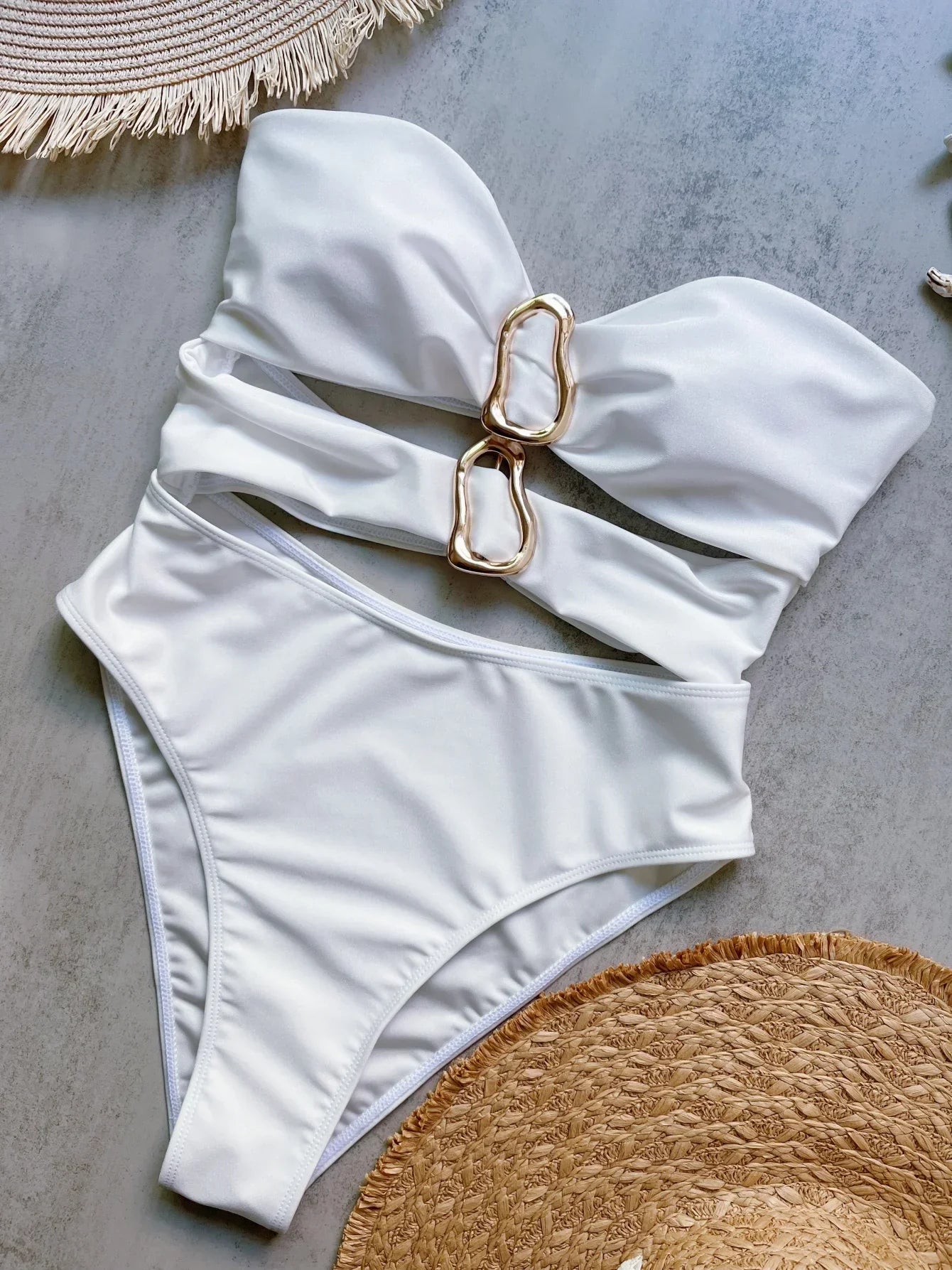 Command attention with a one-piece that’s anything but ordinary. Designed with daring cut-outs and striking metal ring details, this swimsuit brings fearless energy and standout style. Whether you're by the pool or making an entrance, it's all about confidence, edge, and attitude.