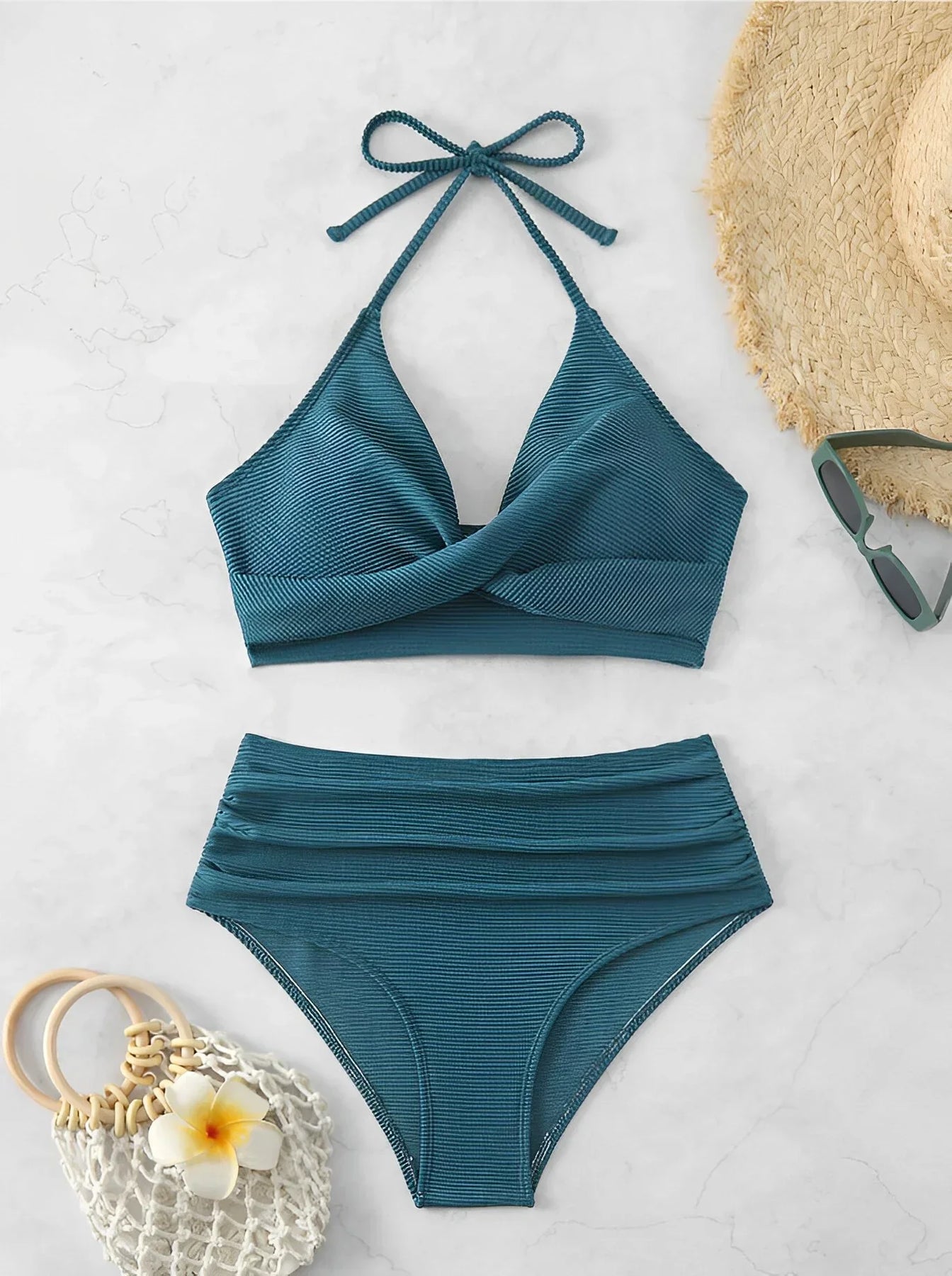 Make a statement with this bold, no-fuss bikini set that’s made to flatter. Featuring a high-waisted bottom and supportive halter top, it delivers just the right mix of style and confidence. Clean lines and a solid colour give it that effortlessly polished edge—perfect for turning heads, wherever the water takes you.